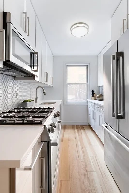 The newly renovated chef’s kitchen features quartz countertops, beautiful modern cabinets with tons of storage, and all pristine Bosch stainless steel appliances; including an extra-large refrigerator, 5 burner stove, dishwasher, and microwave.