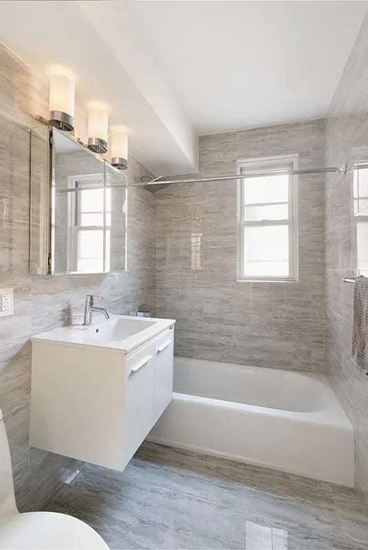The bathroom boasts gorgeous sophisticated grey toned tiles with modern lighting, sleek white vanity, and rain spa-like shower head over a soaking tub.