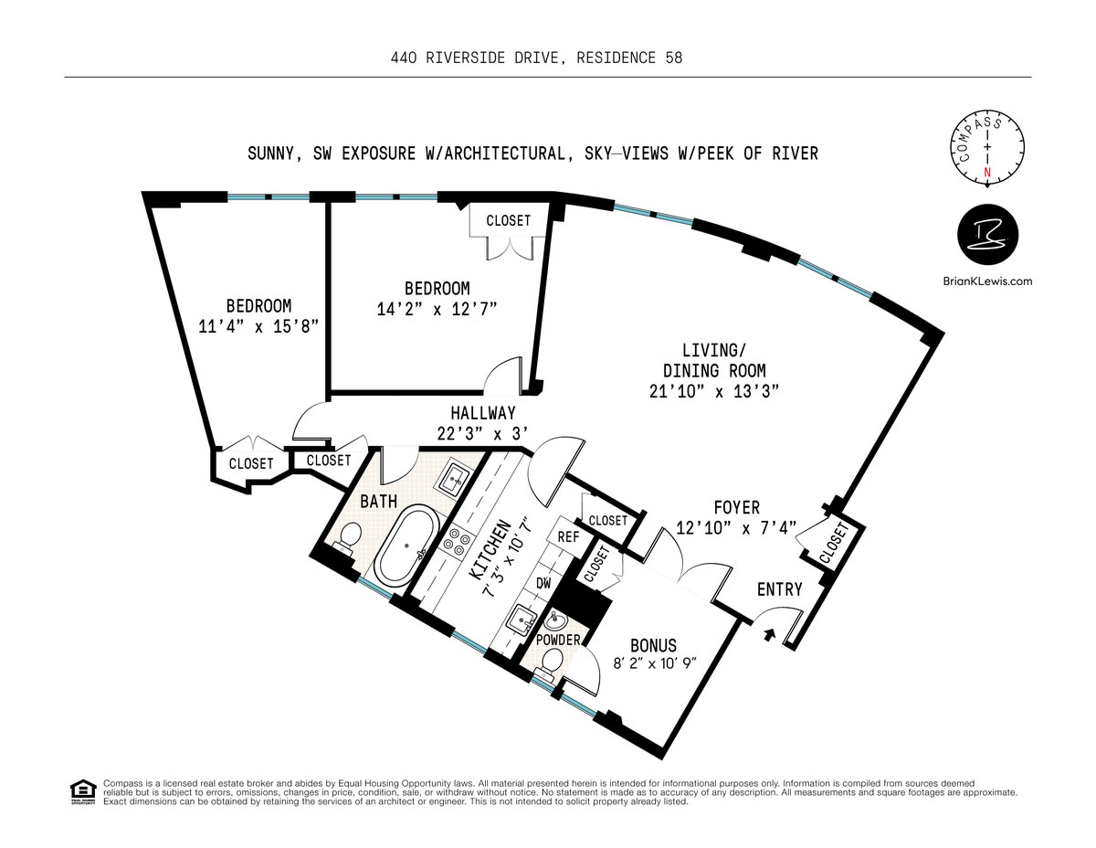 The grand living/dining room spans nearly 22-feet wide, and its four big windows feature a stupendous, South-facing stretch of architectural views that curve down to a sweet, side-peek of Riverside Park and the Hudson River.